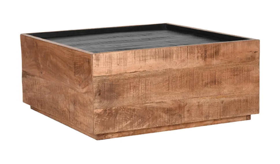 Salontafel Noble heeft een vierkantgevormde basis, gemaakt van rough mangohout. De top van de basis bestaat uit een opstaande rand die een geïntegreerd tafelblad creëert en wordt benadrukt doordat de binnenkant zwart is. Dit vormt een erg leuk en speels contrast! De onderkant is een houten naar binnen staand blok waardoor de suggestie van een zwevende tafel wordt gecreëerd. Tevens staat Noble hierdoor heel erg stevig op de grond!
