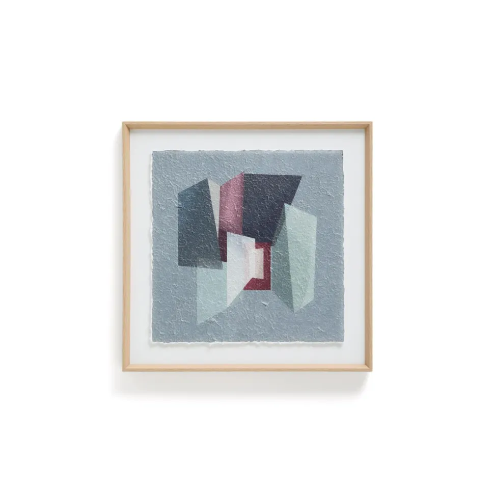 Dit schilderij is geïnspireerd op de kubistische stijl en architectuur uit het midden van de vorige eeuw. Het brengt diepte en karakter in elke omgeving dankzij de combinatie van geometrische vormen en een palet van grijze en bordeauxrode tinten. In dit ontwerp wordt architectuur gedeconstrueerd en gesynthetiseerd om het te weerspiegelen in een uniek artistiek kunstwerk, waar de superpositie van vlakken en het spel met transparanties een visueel effect creëren dat uitnodigt tot contemplatie en een punt van hedendaagse verfijning toevoegt. Het werk is afgedrukt op gerecycled papier en elk detail en elke textuur versterkt de artistieke kwaliteit. De lijst met strakke lijnen zorgt voor visuele lichtheid en laat het werk op zichzelf staan, zodat het gemakkelijk te combineren is met verschillende decoratiestijlen.