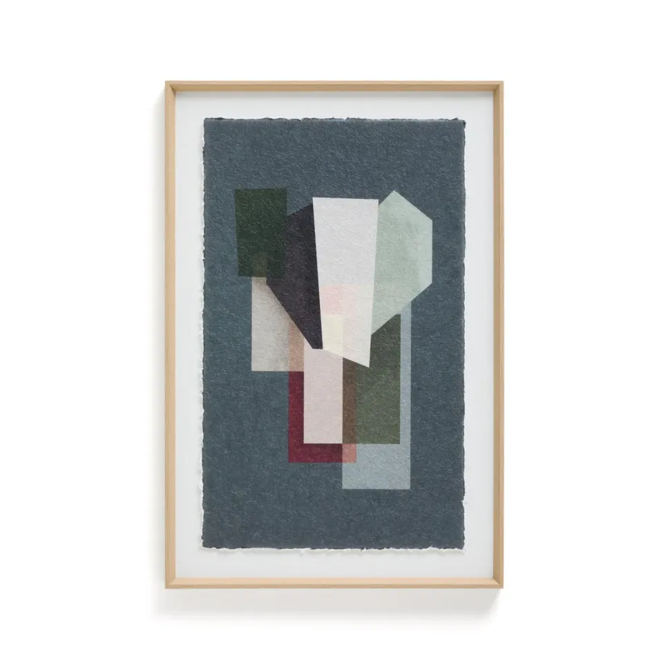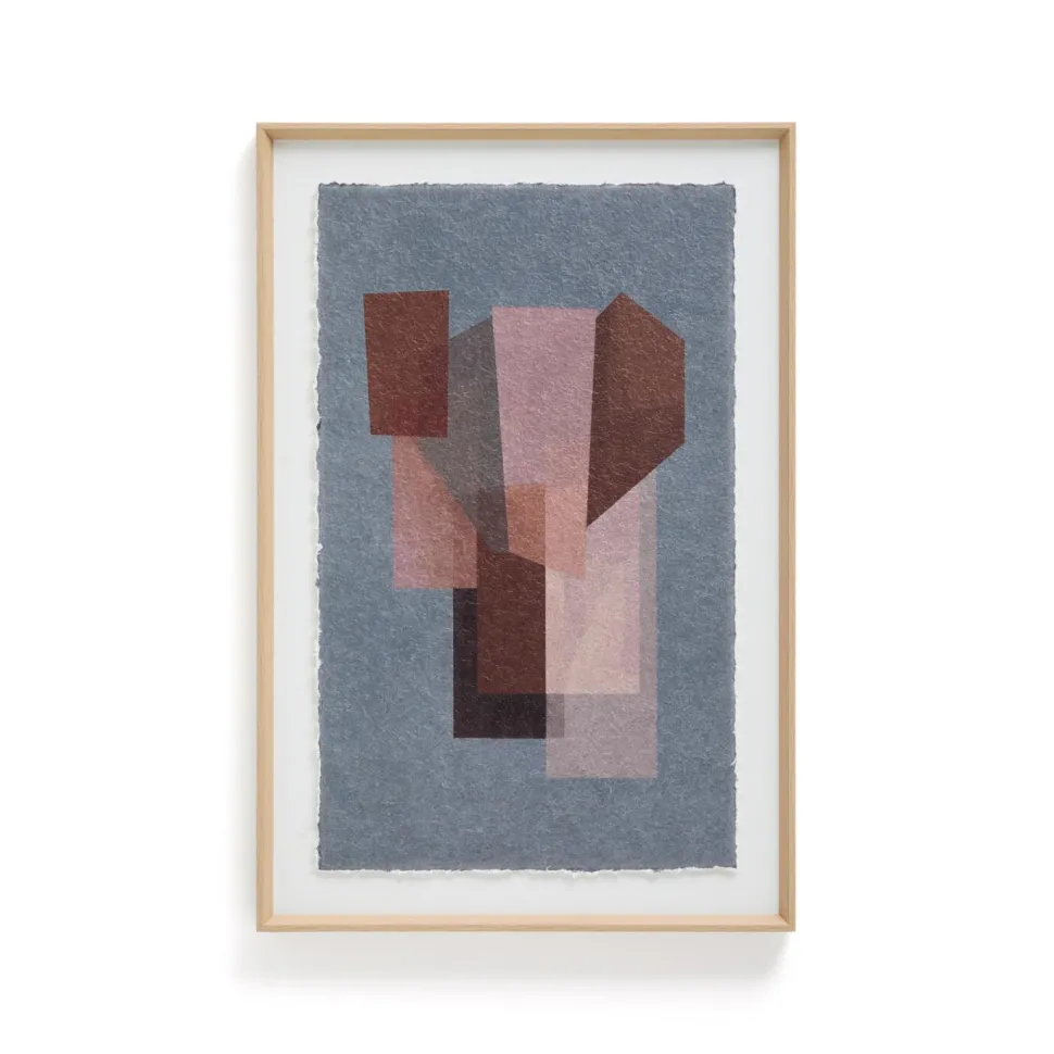 Dit schilderij is geïnspireerd op de kubistische stijl en architectuur uit het midden van de vorige eeuw. Het brengt diepte en karakter in elke omgeving dankzij de combinatie van geometrische vormen en een palet van grijze en bordeauxrode tinten. In dit ontwerp wordt architectuur gedeconstrueerd en gesynthetiseerd om het te weerspiegelen in een uniek artistiek kunstwerk, waar de superpositie van vlakken en het spel met transparanties een visueel effect creëren dat uitnodigt tot contemplatie en een punt van hedendaagse verfijning toevoegt. Het werk is afgedrukt op gerecycled papier en elk detail en elke textuur versterkt de artistieke kwaliteit. De lijst met strakke lijnen zorgt voor visuele lichtheid en laat het werk op zichzelf staan, zodat het gemakkelijk te combineren is met verschillende decoratiestijlen.