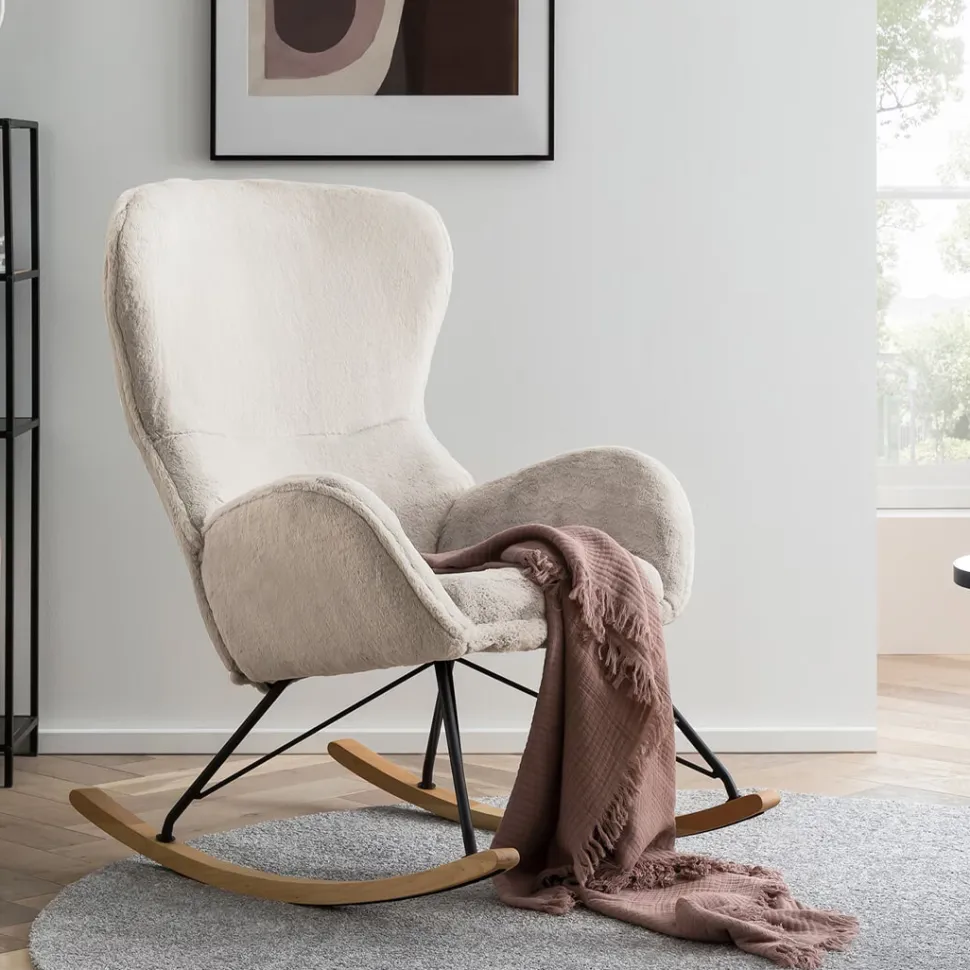 Deze schommelstoel in zachte lamsvachtlook wordt een absoluut favoriet stuk in de woonkamer. De modern vormgegeven schommelstoel biedt optimaal zitcomfort dankzij de gebogen armleuningen en rugleuning. De knuffelzachte zitting van hoogwaardig imitatiebont nodigt ook uit om lekker in weg te kruipen. De trendy Scandi-stijl wordt gecompleteerd door een zwart gelakt metalen frame en houten rails van massief eikenhout. Het moderne glijderframe zorgt voor zacht heen en weer schommelen en maakt de schommelstoel tot de ideale metgezel voor de woonkamer, slaapkamer of leeshoek.