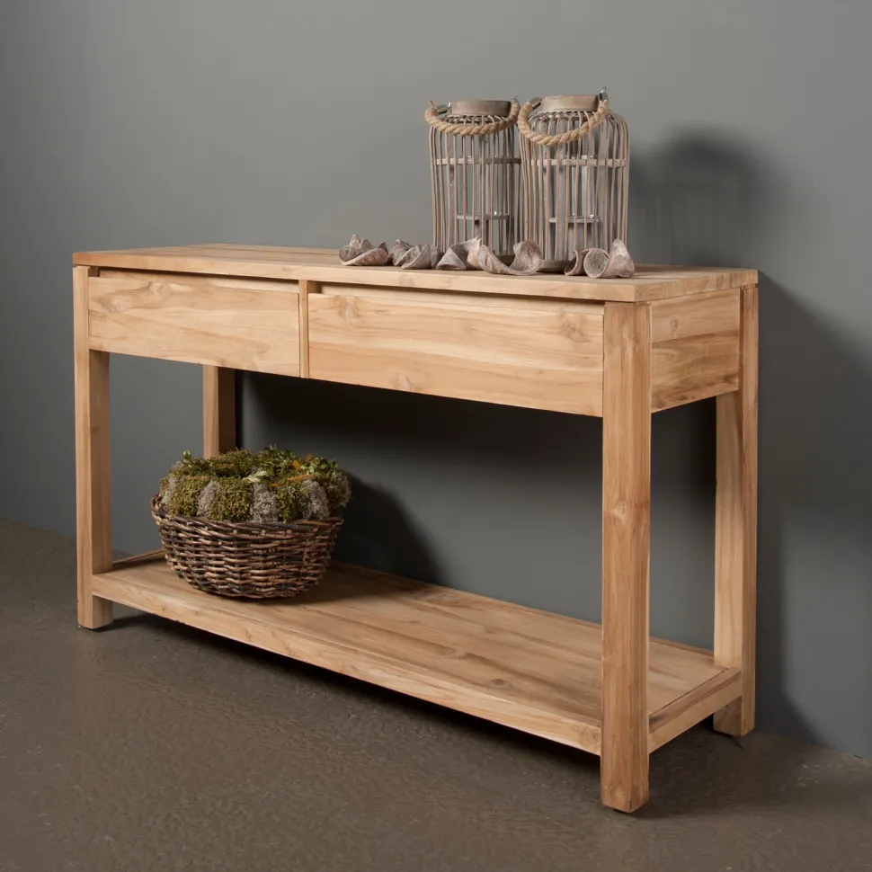 De tafel beschikt over twee praktische lades en een plank onderaan, ideaal voor het opbergen of uitstallen van accessoires, boeken of mandjes.Dankzij het tijdloze design en het gebruik van duurzaam hout past de Corona goed in een landelijk interieur. Een stijlvolle en praktische sidetable die warmte en sfeer toevoegt aan elke ruimte.