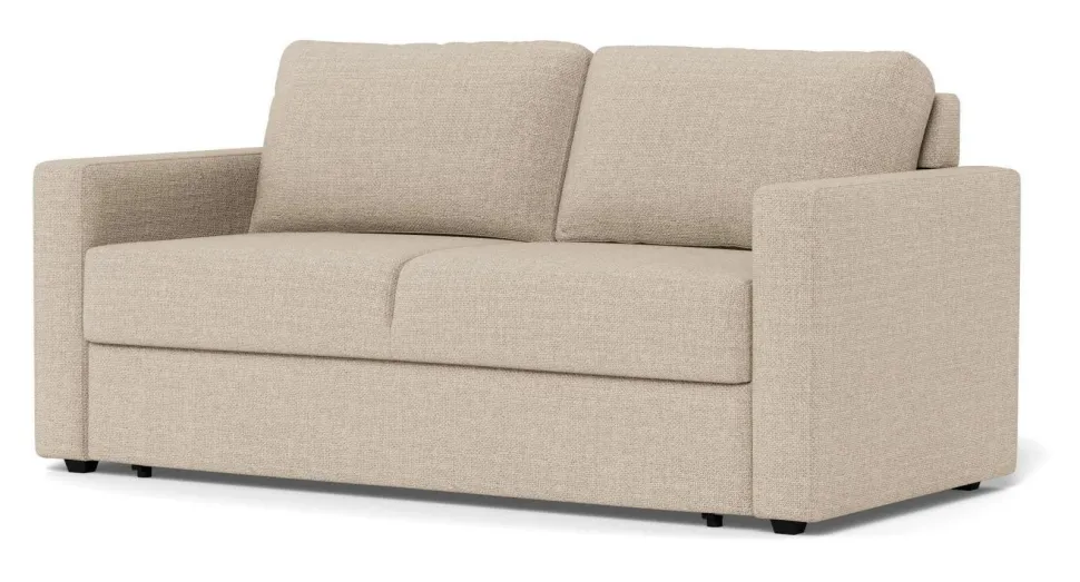 Maak kennis met een slaapbank met armleuningen die een klassieke uitstraling en rechte lijnen heeft. Hij is ontworpen met een uitklapbare bedfunctie om het jou of je gasten comfortabeler te maken. De gestructureerde beige stof met tweekleurig effect is volledig om de bank gewikkeld en siert ook de twee losse rugkussens. Hij staat op ronde zwarte poten.