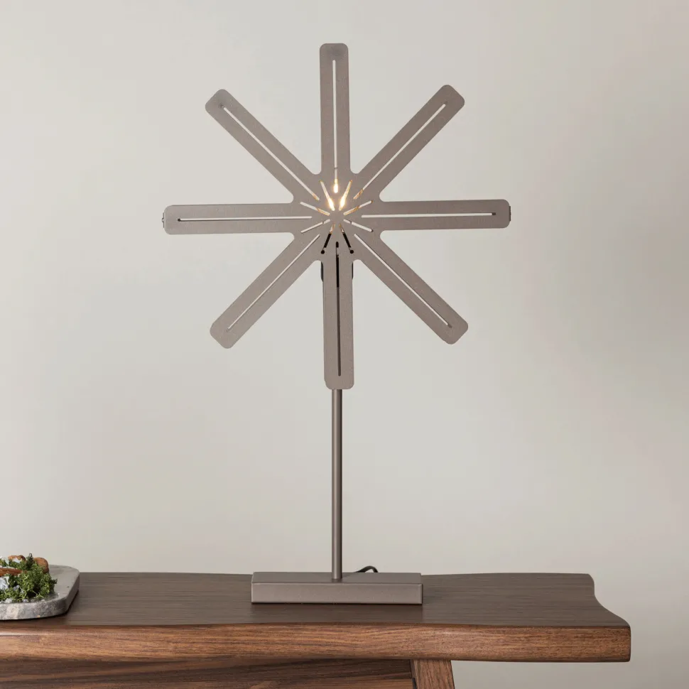 Deze bruine, stervormige tafellamp heeft een slanke lampvoet die hem een elegante en verfijnde uitstraling geeft. De lampenkap lijkt op een ster en verbergt de gloeilamp terwijl hij een royaal en aangenaam licht in de kamer verspreidt. Met Aimie creëer je een ontspannen en gezellige sfeer, of je hem nu op je bureau of in de slaapkamer zet.