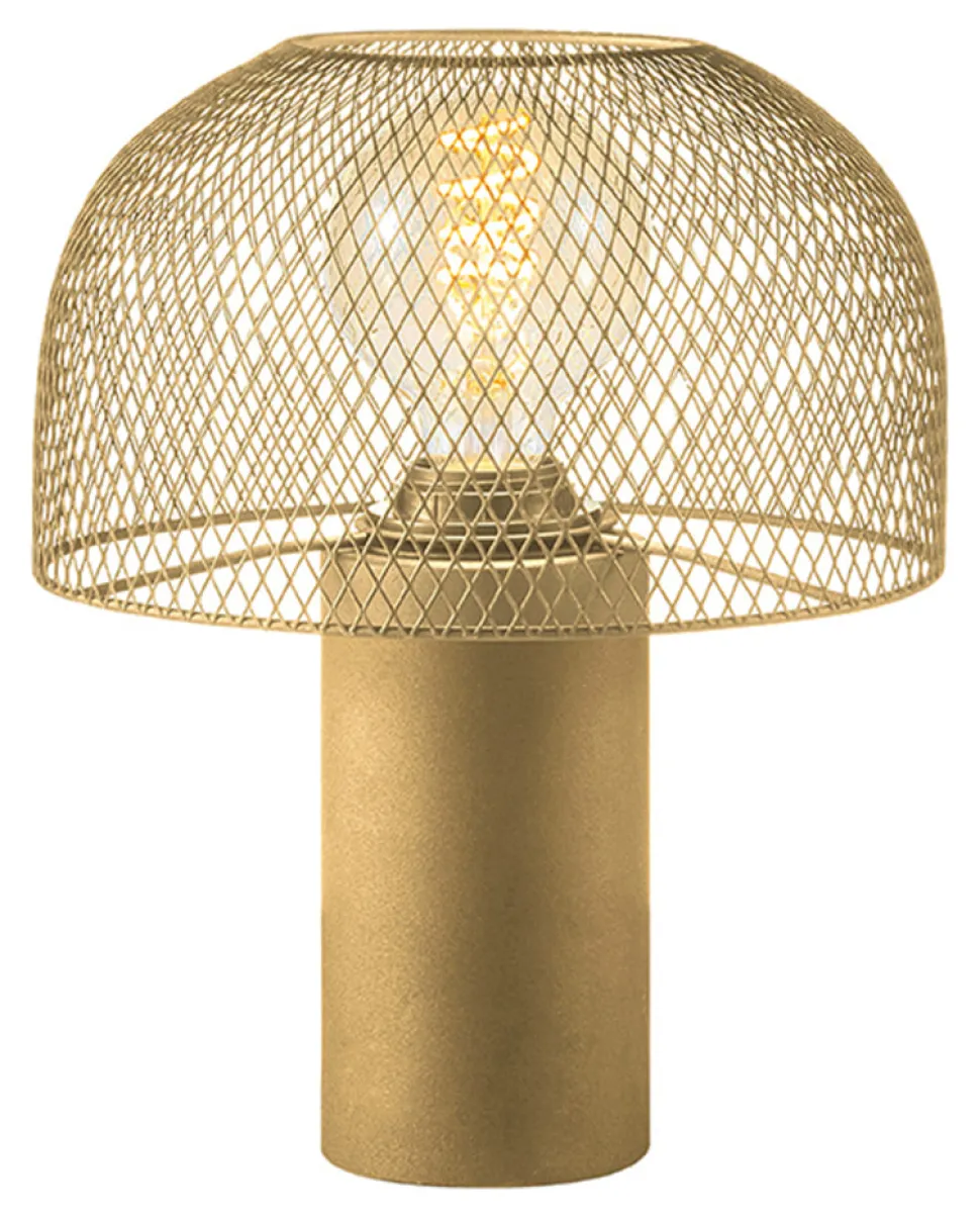 Tafellamp Fungo, uitgevoerd in goud heeft een ronde, goud metalen kap voorzien van gaasstructuur die middels de fitting is verbonden aan de mooie robuuste metalen basis. Deze combinatie van vormen zorgt voor een volumineus en luchtig uiterlijk met heel veel elegantie. Het gaas en daarmee de transparantie van de kap zorgt voor een prachtig lichteffect. De dimmer op de lamp zorgt dat de lichtsterkte altijd naar wens aangepast kan worden. Fungo heeft een zwart strijkijzerkoord en een E27 fitting.