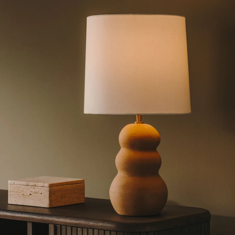 Verlichting en design komen samen in de Madsen-collectie. De lamp is gemaakt van terracotta, een natuurlijk materiaal dat elke lamp exclusief en anders maakt. Hij zorgt voor warmte in je kamers dankzij de natuurlijke afwerking en de witte stoffen lampenkap.