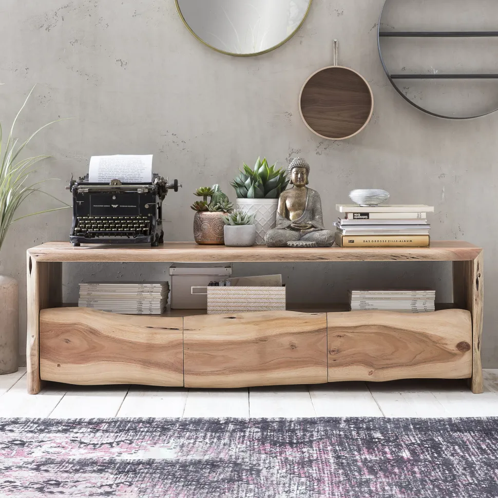 Massief acacia met dat zekere iets, natuurlijk gegroeide vormen van hout worden het stijlbepalende element van de meubels – ja, de natuur is hier niet getrimd. Daarom zit er veel kunst in de productie, want je moet elke plank zorgvuldig lezen en de juiste rangschikking ten opzichte van elkaar vinden, zodat er een samenhangend beeld ontstaat zoals hier. Uiteindelijk is geen van deze eindproducten hetzelfde, zodat elk van deze fascinerende meubelstukken gegarandeerd uniek is. Als je van het echte werk houdt en op zoek bent naar iets bijzonders, dan ben je hier aan het juiste adres. 3 lades en het ruime open vak bieden diverse opbergmogelijkheden.