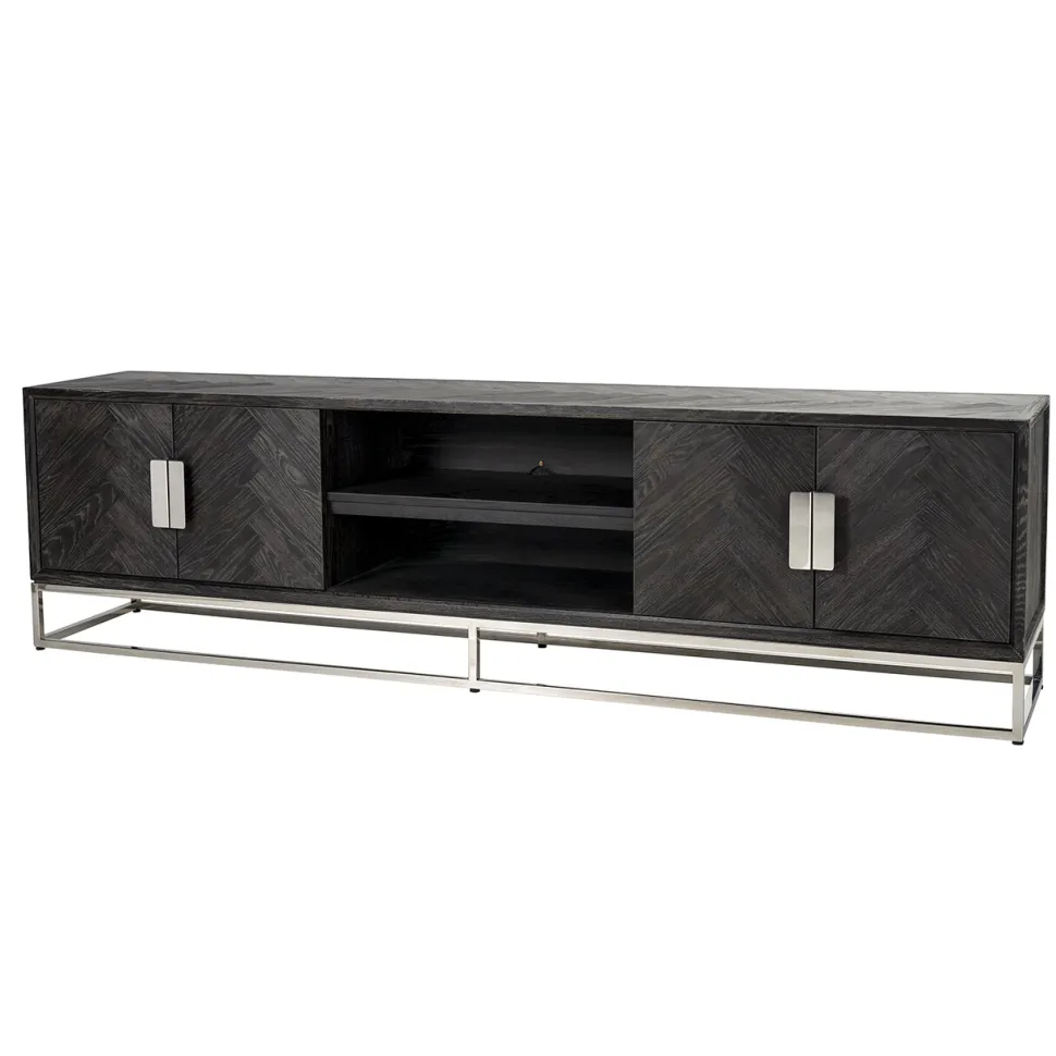 TV-dressoir 220 Blackbone silver 4-deuren is gemaakt van eiken en RVS. Het zwarte TV-dressoir uit de Blackbone collectie geeft je interieur een elegante, maar toch ook stoere touch.
