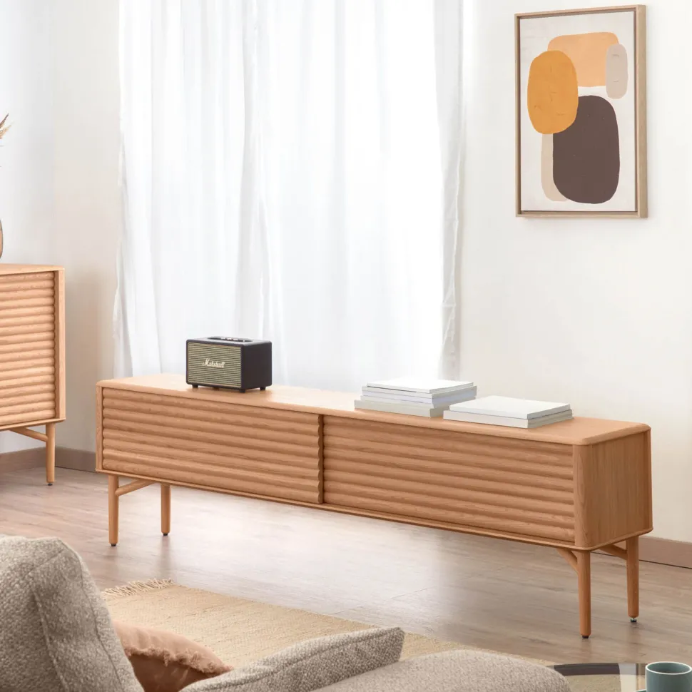 - TV-meubel van massief eiken en eikenfineer. Uniek ontwerp met afgeronde hoeken en reliëf op de deuren.