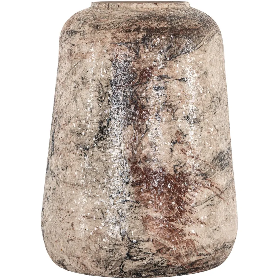 Vaas Dena small heeft een ronde vorm en een gespikkeld beige oppervlak. Een decoratieve vaas met natuurlijke tinten, perfect op zichzelf of gecombineerd met de grote versie.