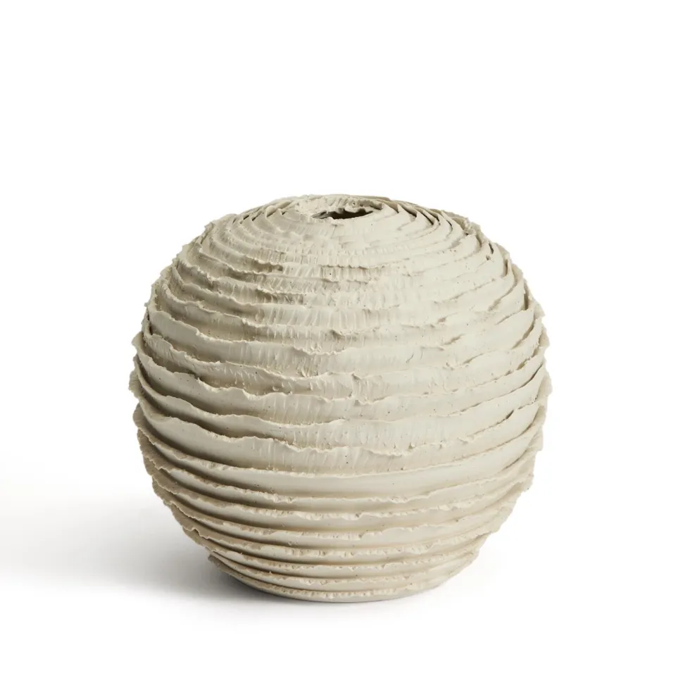 De Evania-collectie is met de hand vervaardigd op een draaischijf, wat elke vaas karakter geeft en een uniek stuk maakt. Het oppervlak heeft fijne horizontale groeven die de hele vaas omringen, en zorgen voor een spel van licht en textuur dat authenticiteit uitstraalt. De afgeronde, organische vorm nodigt uit tot contemplatie en brengt visuele balans in elk interieur. Perfect om bloemen in te presenteren of als op zichzelf staand decoratief object.