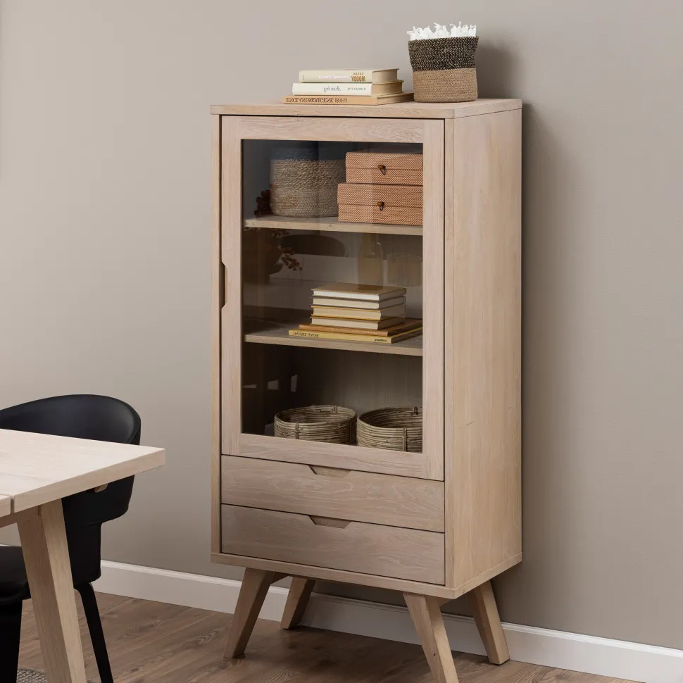 Deze vitrinekast is een moderne kijk op klassiek Scandinavisch design met een slank profiel voor een eigentijdse expressie. Met 2 lades en 2 verstelbare planken achter een transparante glazen deur kun je je schatten georganiseerd en beschermd tegen stof bewaren. Hij is uitgevoerd in wit gepigmenteerd geolied eikenhout en eikenfineer voor een strakke uitstraling.