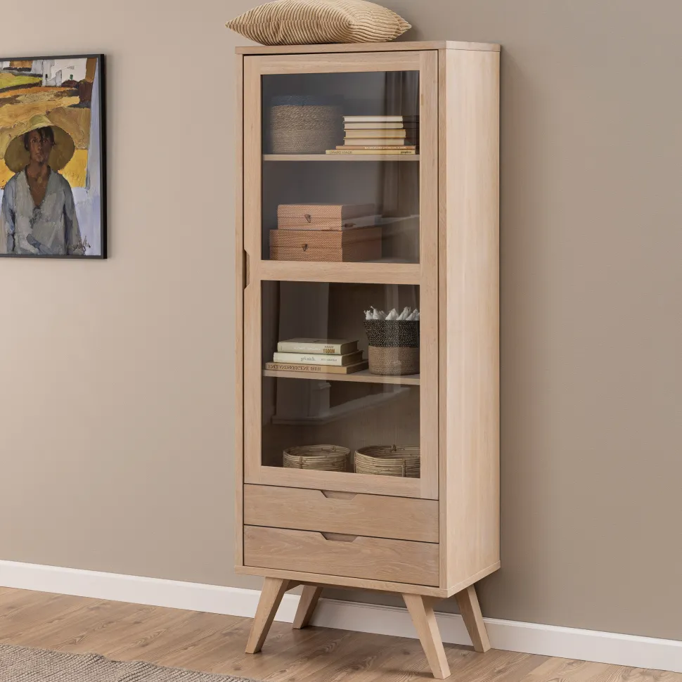 Dit kabinet is een moderne interpretatie van klassiek Scandinavisch design. Het slanke profiel geeft een lichtgewicht en eigentijdse uitstraling aan het meubel. Het kabinet biedt voldoende opbergruimte achter de glazen deur en voor opslag uit het zicht kunt u de 2 laden gebruiken. Let op de geïntegreerde handgrepen.