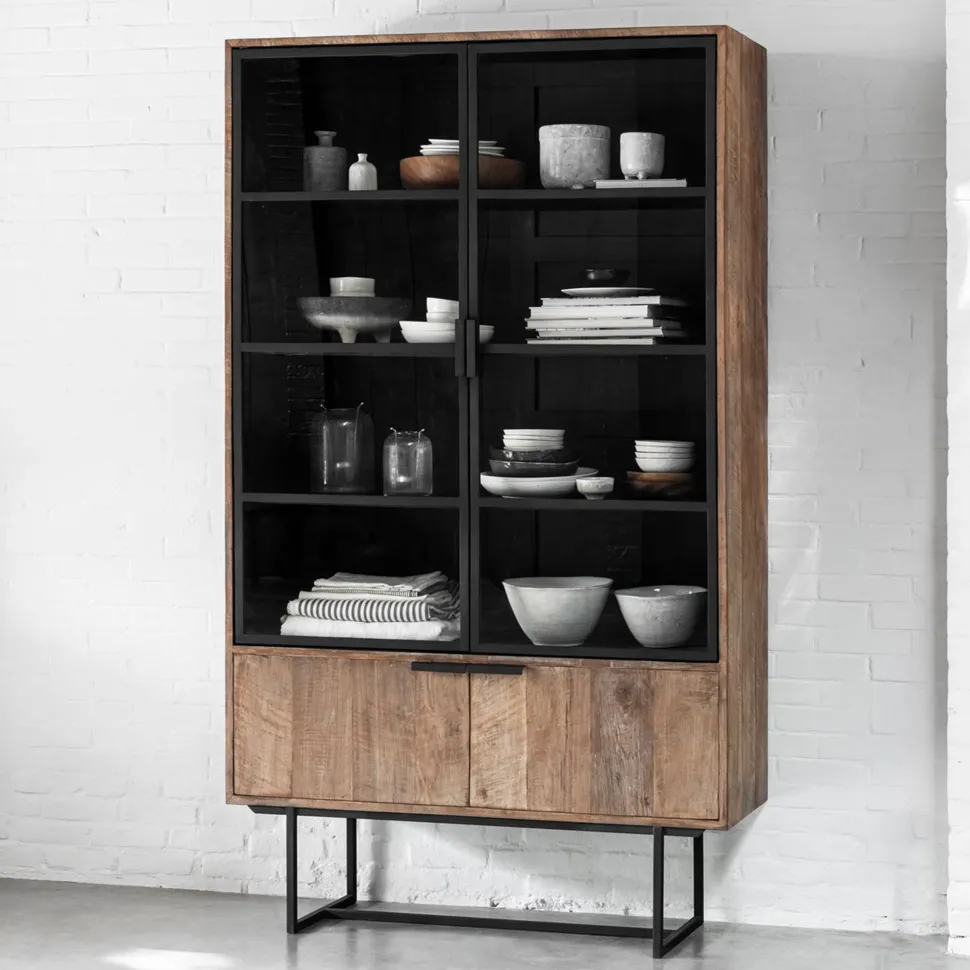 Vitrinekast Odeon is gemaakt van teakhout en is afgewerkt met een zwart metalen frame. De kast heeft een afmeting van 210x120x40 cm en heeft 2×2 metalen deuren.