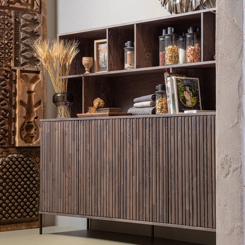 Een unieke aanvulling op het New Gravure dressoir, uit de collectie van het Nederlandse interieurmerk WOOOD, de New Gravure wandkast. De wandkast is uitgevoerd in essen fineer met deuren van essen vingerlas en afgewerkt met een bruine espressokleurige beits. Het interieur is gevormd uit zwartgekleurd spaanplaat. Presenteer jouw mooiste woonitems in de vakkenkast en ontdek een zee aan opbergruimte achter de vier reliëf deuren.