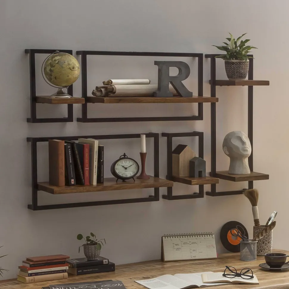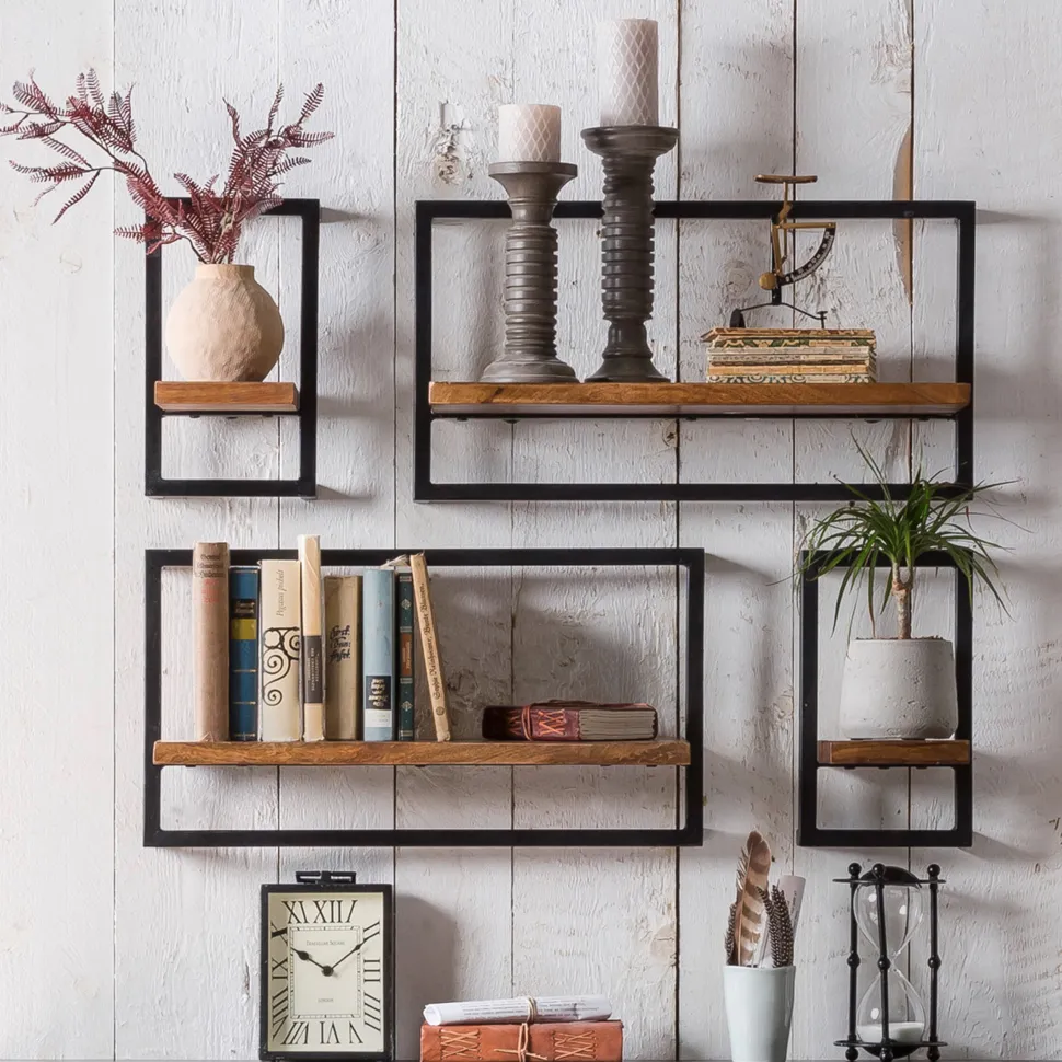 Deze set van 4 wandplanken met mangohout en op antiek afgezette metalen frames kun je individueel ophangen en zo je creativiteit de vrije loop laten. Natuurlijk kun je de planken ook afzonderlijk gebruiken in verschillende kamers, of het nu een woonkamer, keuken of logeerkamer is. Het gebruik is zeer veelzijdig.