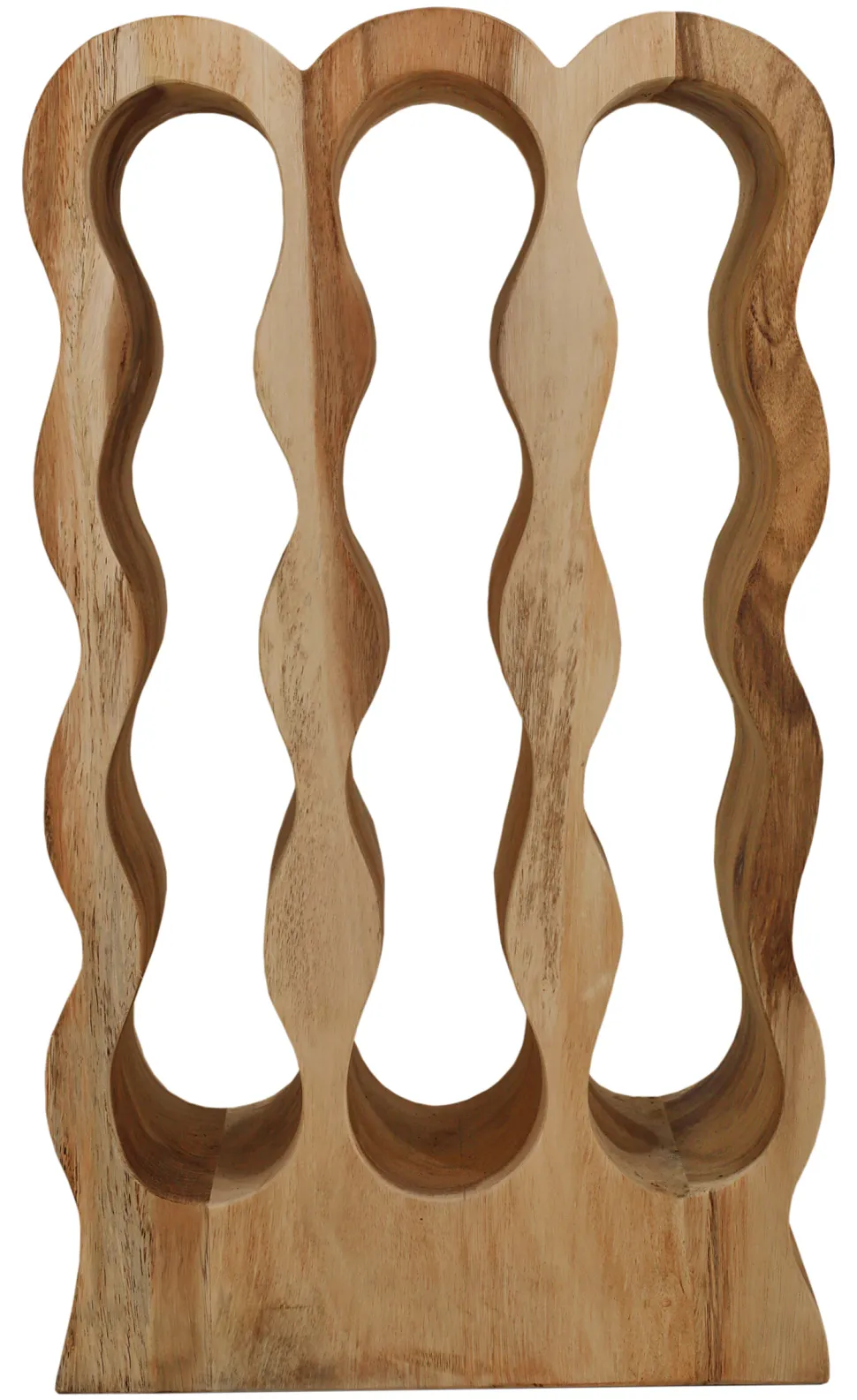 Het wijnrek van hoogwaardig Suar-hout is een perfecte oplossing om je mooie wijnen stijlvol en compact op te bergen. Met ruimte voor maximaal 4 flessen is dit rek een handige manier om je wijnen netjes en veilig te bewaren. Het bijzondere aan dit wijnrek is het Suar-hout, dat bekend staat om zijn duurzame kwaliteit en unieke nerf. Elke fles wordt stevig vastgehouden door de golfvormige steunen en tegelijkertijd mooi gepresenteerd. De zachte golfvormen van het rek passen mooi in de kamer en zorgen voor een fijne sfeer. Het natuurlijke hout geeft een warme, organische uitstraling die perfect past bij verschillende interieurstijlen. Met zijn zorgvuldige afwerking en aantrekkelijke ontwerp is het rek niet alleen stevig, maar ook een echte blikvanger. Het benadrukt de natuurlijke charme van het hout en laat je wijnflessen in stijl zien. Of het nu in de woonkamer, eetkamer of op het aanrecht is – dit wijnrek zorgt ervoor dat je favoriete wijnen perfect worden gepresenteerd en is tegelijkertijd een decoratief statement in je huis. Voor wijnliefhebbers die functionaliteit en esthetiek willen combineren in een compact meubelstuk, is dit wijnrek de ideale keuze. De golvende structuur en natuurlijke schoonheid van Suar-hout maken het een uniek hoogtepunt dat je wijncollectie laat zien en een vleugje luxe aan je kamer toevoegt.