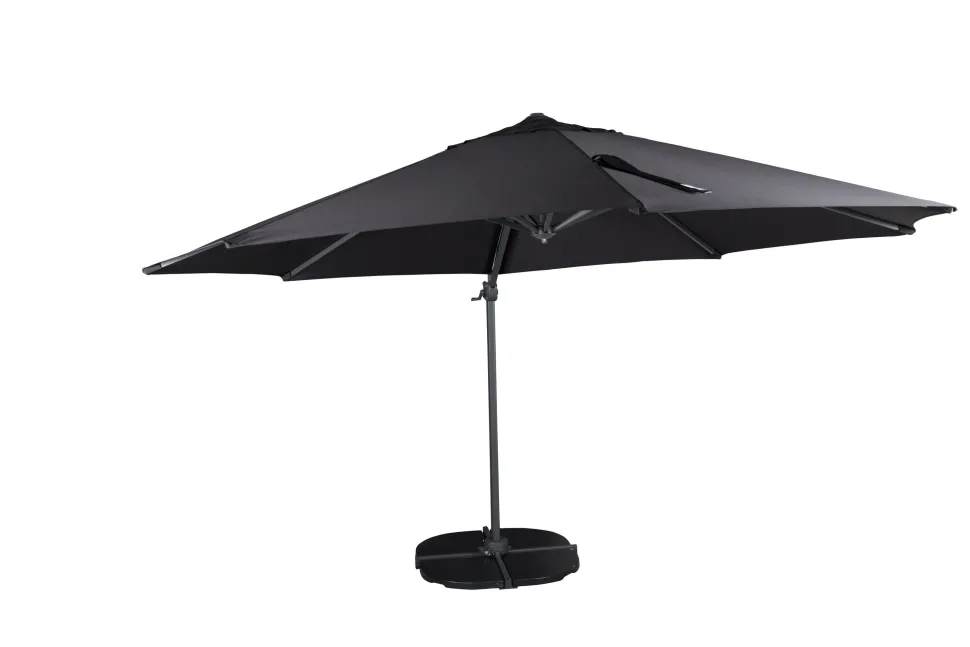 Een grote en stevige parsor in zwart, draaibaar om zijn eigen schouder. Verstelbaar in verschillende helderheden, goede bescherming tegen de zon en gemakkelijk schoon te houden.