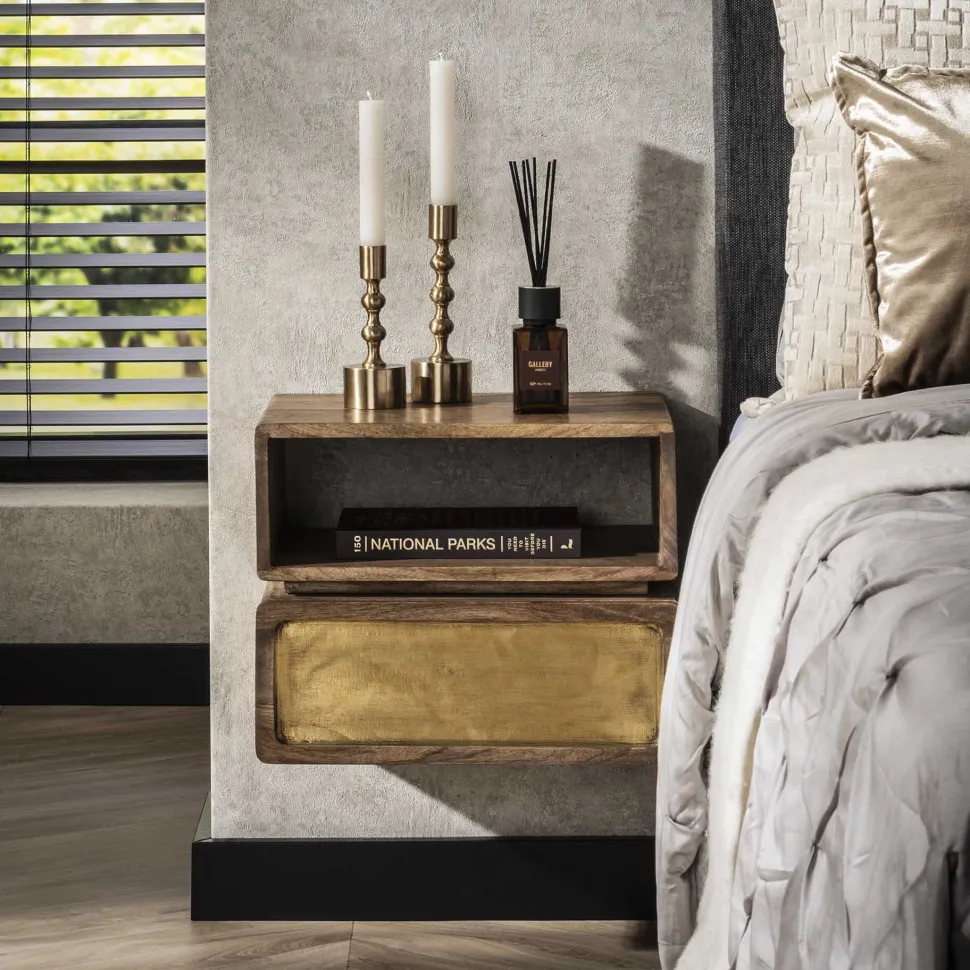 Dit hangende nachtkastje is gemaakt van massief duurzaam mangohout en heeft een echt messing beslag. Dit wordt door middel van cladding gecreëerd. Het messing is licht geantiqueerd. Het nachtkastje beschikt over één lade en één open vak. Het nachtkastje wordt bevestigd aan de muur met een strip met drie schroefgaten, waardoor het zweeft en ruimte bespaart.